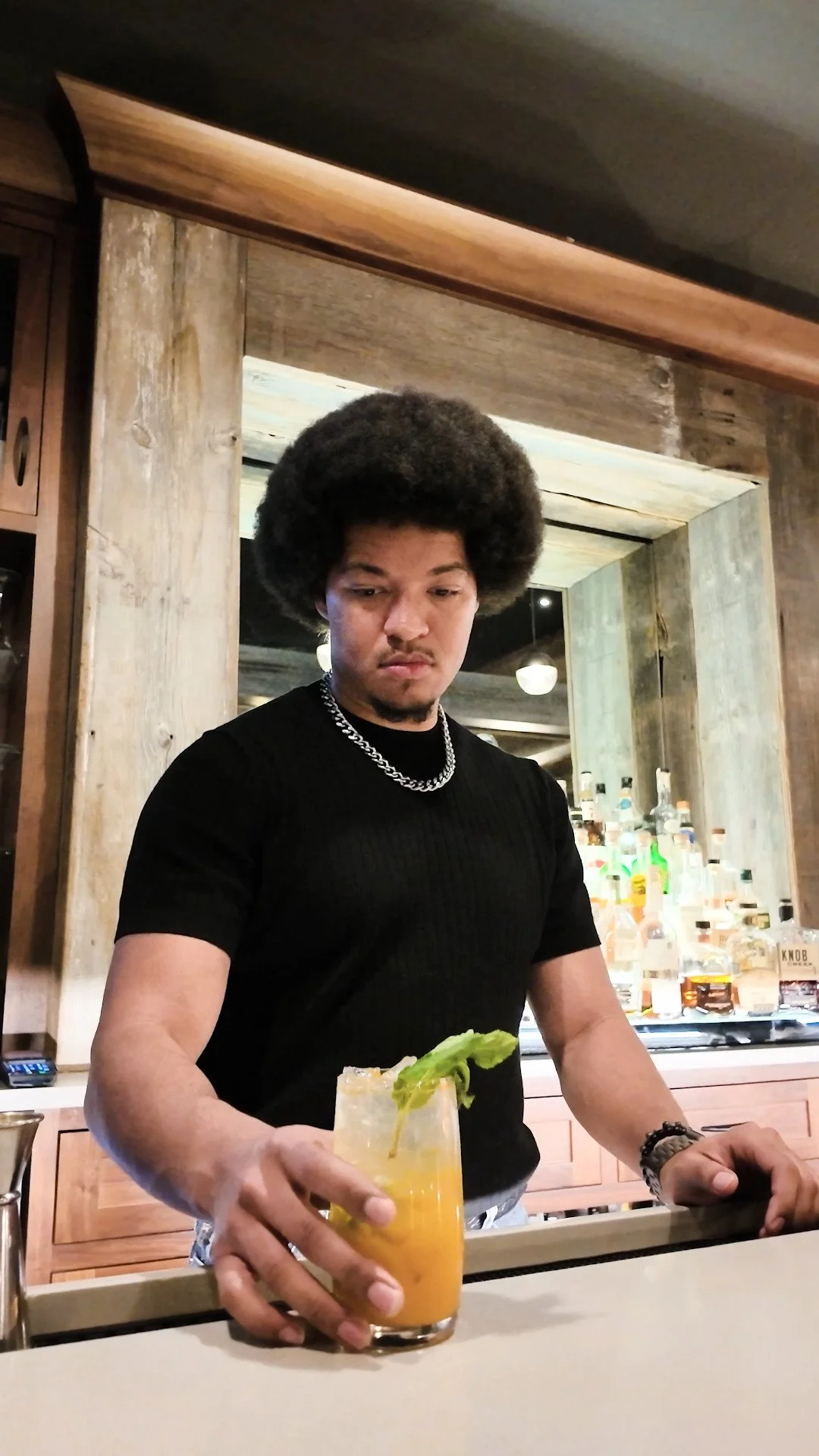 The style takes a cue from Scandinavian minimalism with a rustic farmhouse decor accented by mid-century design elements, industrial elements, and warm earthy colors and natural tones. The atmosphere is inviting and approachable, suitable for everyday dining and also features a full bar, private dining room, and outdoor patio.
